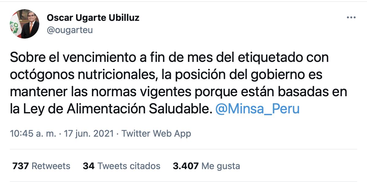 A few weeks ago, the food industry asked the Peruvian Government for an extension period to use them considering the challenges derived from the COVID-19 pandemic. Although there is no official communication issued by the Ministry of Health, the minister Oscar Ugarte tweeted that the measure will be kept and fully implemented according to the current schedule.